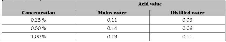Acid value (SH): The Soxlet-Henkel (SH) acid value is the number of millilitres of 0.25 N sodium hydroxide solution required to neutralise 100 ml of solution using phenolphthalein as indicator (end point pH 8.3)