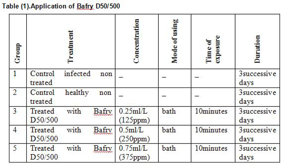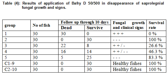 The most effective method for controlling and preventing saprolegniosis in fish ecosystem is a combination of good fish management as good water quality and avoid adverse water temperature and Bafry D50/500 used for controlling in a concentration of 0.75ml/L (375PPm) as a bath for 10 minutes.