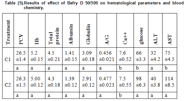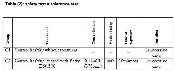 Trial of using Bafry D50/500 for control in saprolegniosis in a dose of 0.75 ml/L (375ppm) for 10-12 minutes for 3 successive days as a bath gave good results in treatment of the diseased fish in aquaria, this were indicated the rate of mortality reach 16.7% without any effect on the healthy stat of treated fish and also no effect on hematology and blood chemistry of treated fish with Bafry D50/500. Histopathological finding of treated fish with Bafry D50/500:skin showed increase of M.M.C. and slight sloughing of most superficial layer of epidermis but the gills showed hyperplasia of epithelial cells covering of primary lamellae, this indicate that the infected fish was treated with BafryD50/500